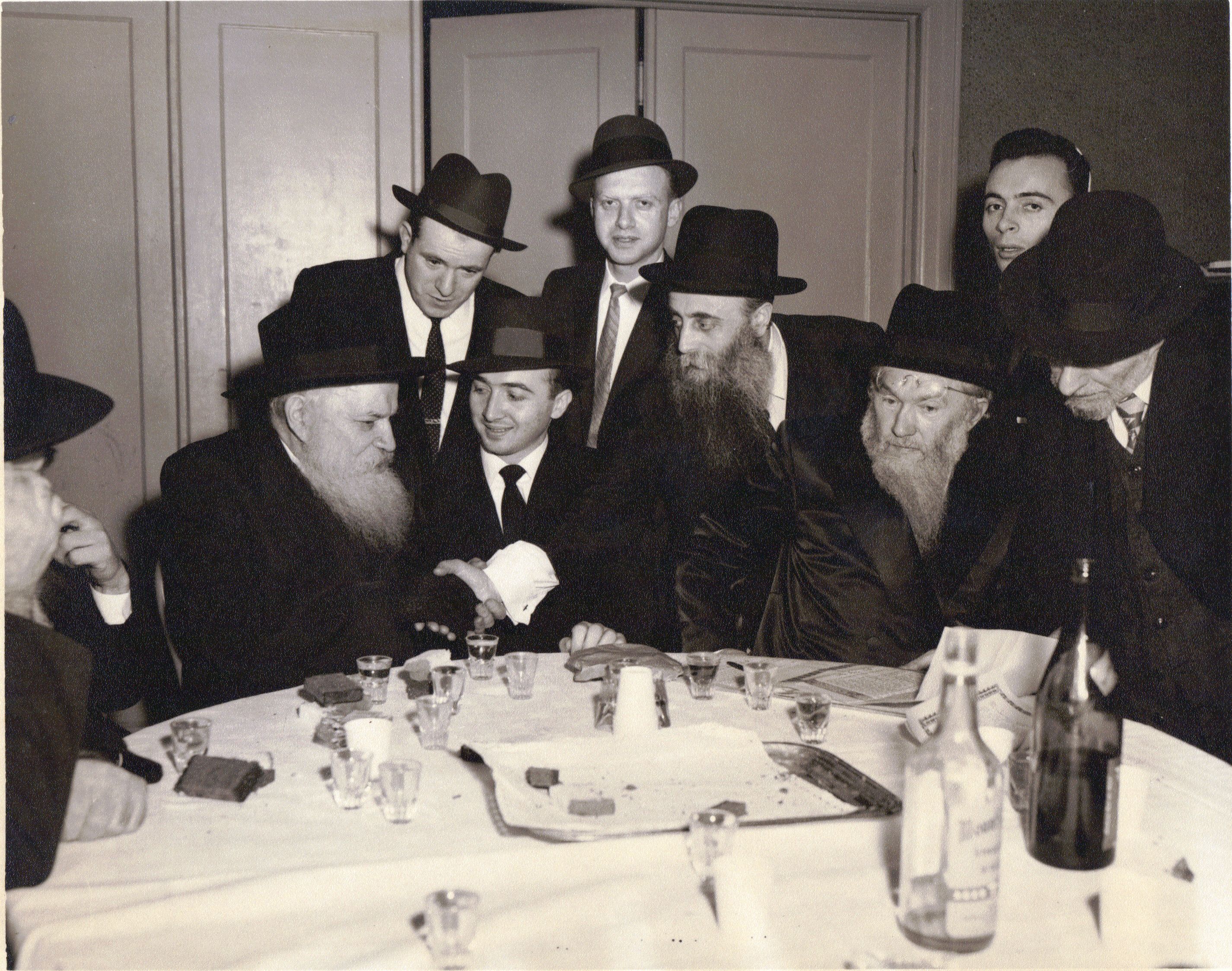 Picture at my father's wedding November 13, 1958. From left to right my grandfather's best friend, the Chassidic head, Rebbe of the Radziner Chassidim a sect of Chassidim, Rabbi Yerucham Leiner shaking my grandfather's hand; A member of the Rebbe's family; My father Rabbi Myer Asper/Aspes; Moshe Aspes, my father's oldest brother; Their father my grandfather Rabbi Yitzchak Yerachmiel Aspes; Rabbi Aaron Yehudah Arak, my mother's mother's brother, they were children of Hinda Renke Arak sister of a famous rabbi in their old country Rabbi Meir Arak; Pinchas Asper/Aspes, my father's next older brother; And lastly but not leastly my father's Rabbinical Teacher.