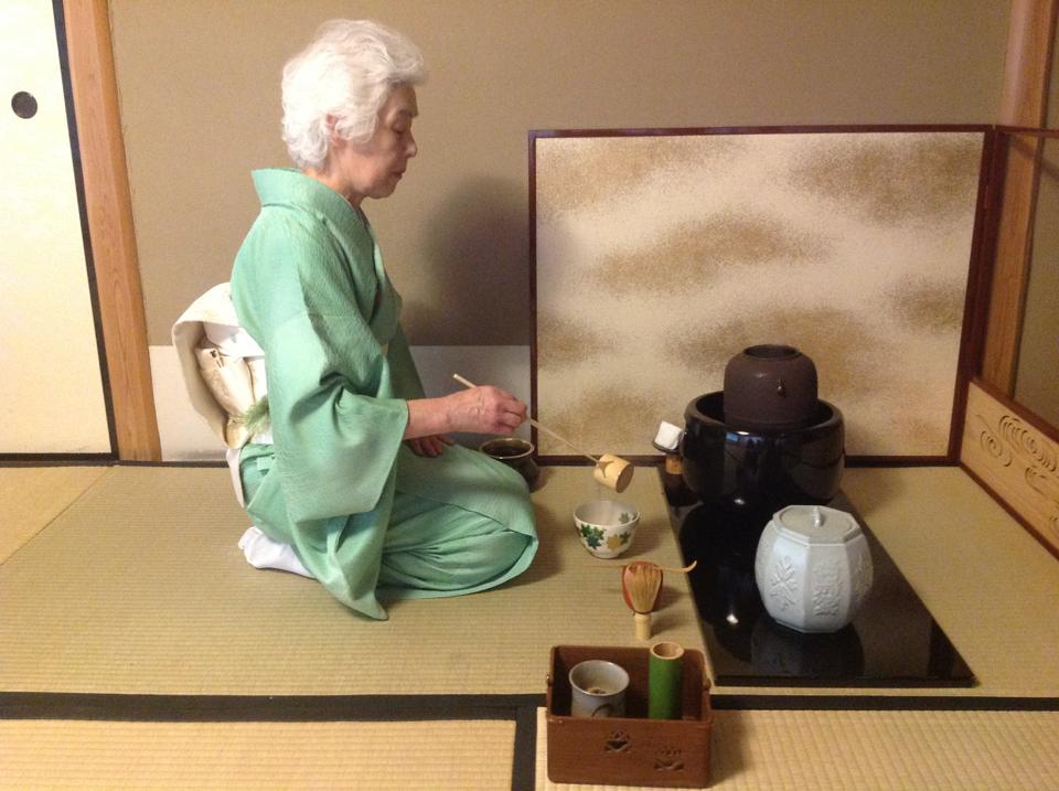 A door made of rectangular rice paper windows opens. Two outstretched hands reach through the doorway and place a utensil on the floor. The hands, now pressed on the floor, allow their master to shuffle into the room. The master is a Japanese woman, dressed in beautiful green robes (kimono) with a large belt and a bow tied in the back. She picks up the utensil, places it ahead of her again, and shuffles toward it a second time. Finally within the room, she stands, walks slowly toward the flag of poetry enshrined on the wall, kneels and bows to it. She then approaches the kama, the water vessel in the room, inspects it and the ornate vase misisashi next to it. Since everything is correct, she walks to the corner of the room, by the door to kneel and rest. She is guest.