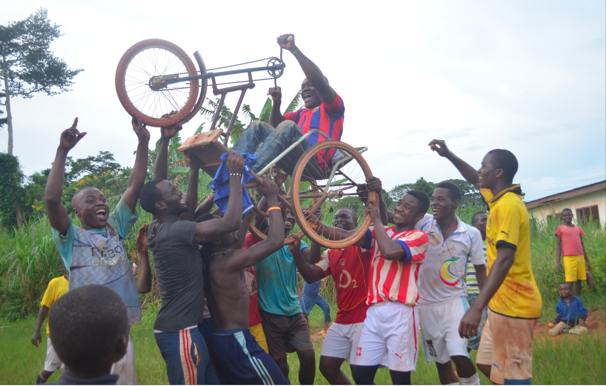 Beside his passion as technician, Ibrahim is a great fan of soccer/football game. In Cameroon, Soccer/football is not only a game as we would think, it is a religion, and everybody is involved; children, adolescents, women, adults and elders. And for those who are not naturally granted with two legs, they can go play with braces or crutches. Ibrahim knows early in his life that he wouldn’t play the ball himself, and for a while he cheered the teams sitting on a wheelchair and one day he felt like not only waiting next to the stadium, he wanted to be in the game and field on the grass under the wheels of his tricycle, since he cannot stand and run.