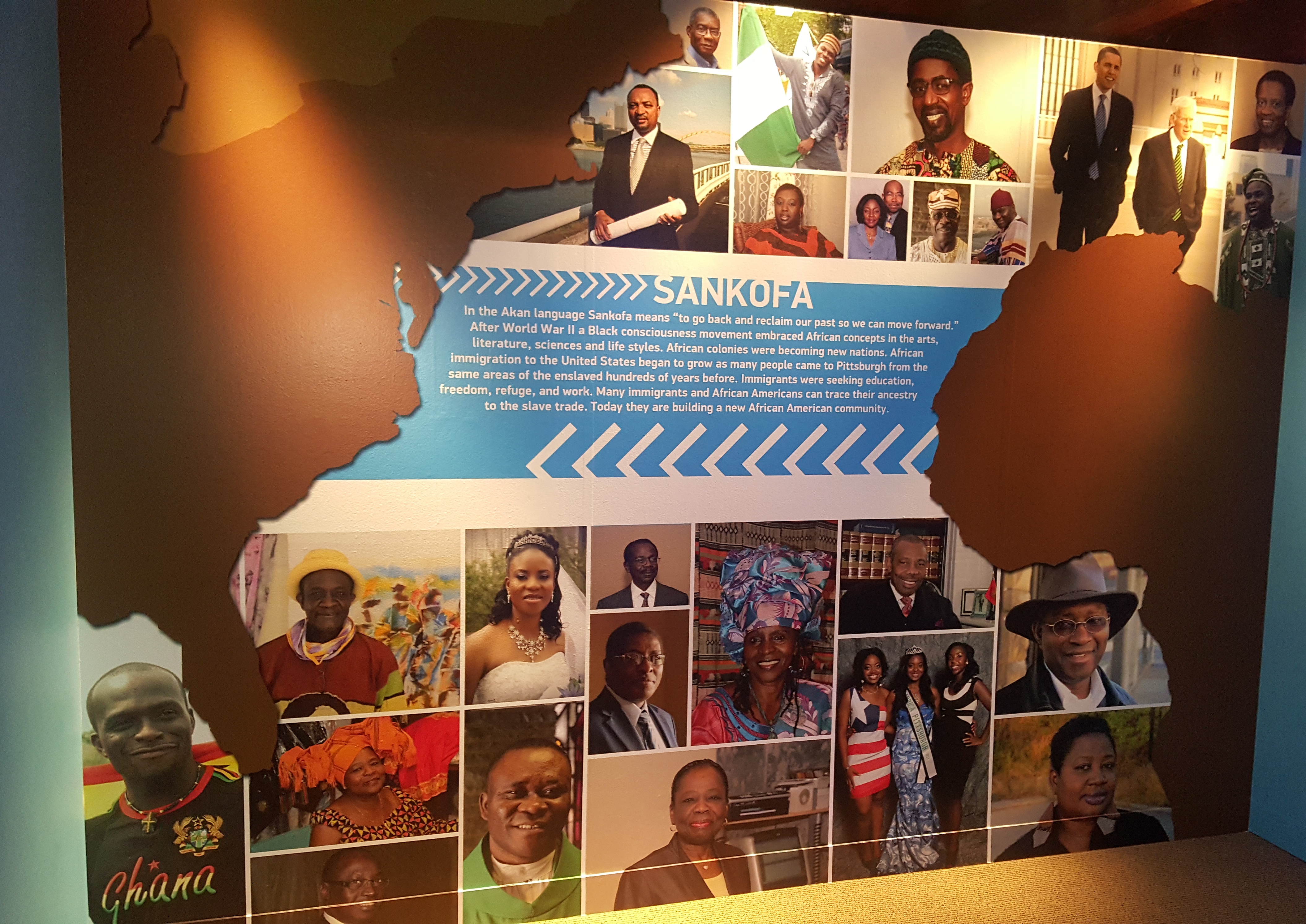 On the fourth floor of the Heinz History Center, there engraved in color are some pictures revealing transitions of the black struggle, liberation, love, unity and power, the Black History and the African migration into the greater Pittsburgh area and also the modern rich social, culture, education and the economic impact that we have brought with us into the region. I am proud to be a part of this historic wall side by side with Barack Obama, John Jack, rufus Idris, Mama Kadiatu, Albert Duroue, Robert Agbede and others that you might recognize as I proudly wave my Nigerian Flag and lift Africa high.