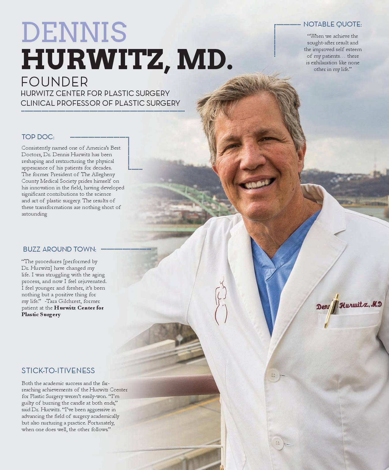 Consistently named one of America’s Best Doctors, Dr. Dennis Hurwitz has been reshaping and restructuring the physical appearance of his patients for decades. The former President of The Allegheny County Medical Society prides himself on his innovation in the field, having developed significant contributions to the science and art of plastic surgery. The results of these transformations are nothing short of astounding.