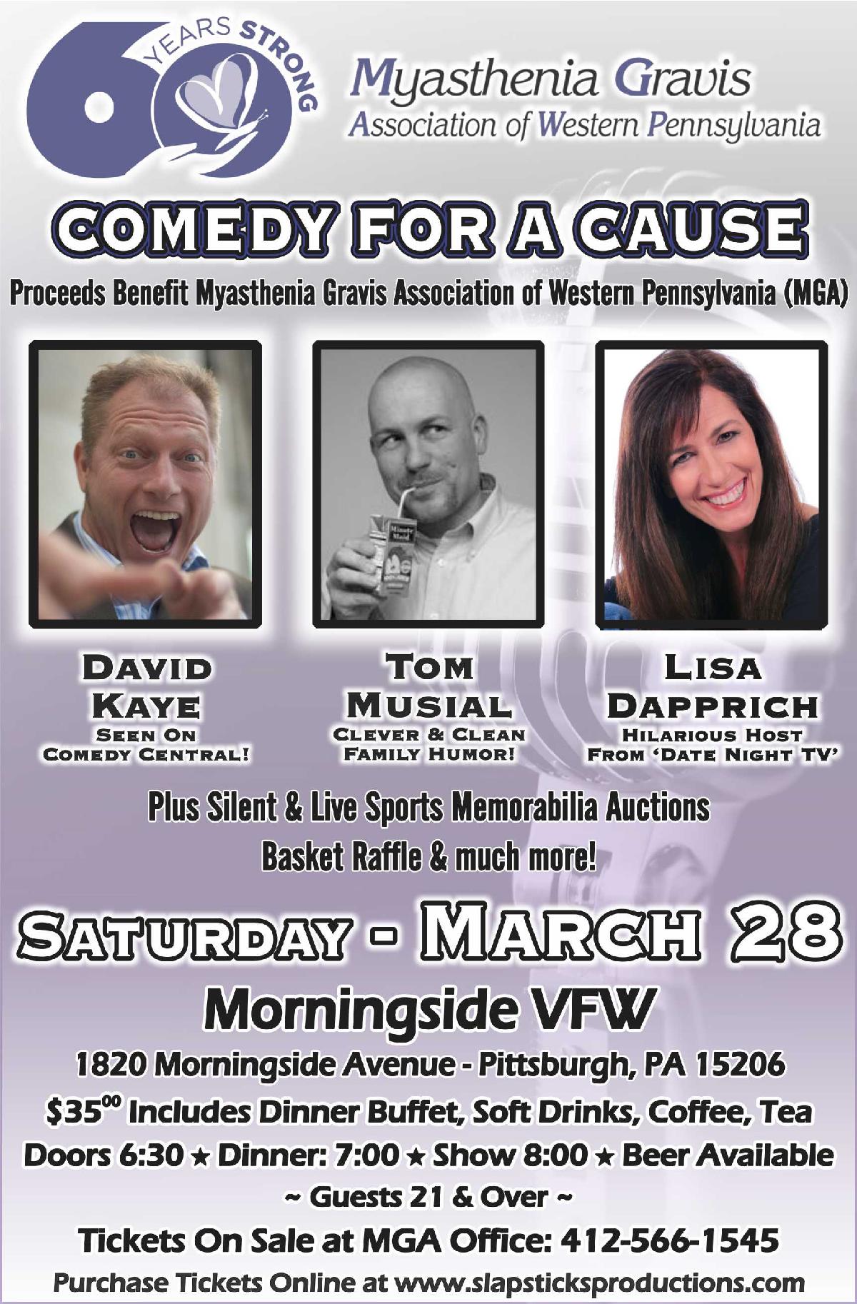 Comedy for a Cause will be held March 28, 2015, at the Morningside VFW. Proceeds from the evening will benefit the Myasthenia Gravis Association of Western Pennsylvania. Comedians scheduled to appear include David Kaye, a Pittsburgh native who has appeared with Drew Carey, David Brenner, Weird Al Jankovic and on Comedy Central; Tom Musial, also of Pittsburgh, who has shared stages with Jim Breuer and Eddie Ifft; and Lisa Dapprich, host of Date Night TV and a longtime regular at local comedy clubs.