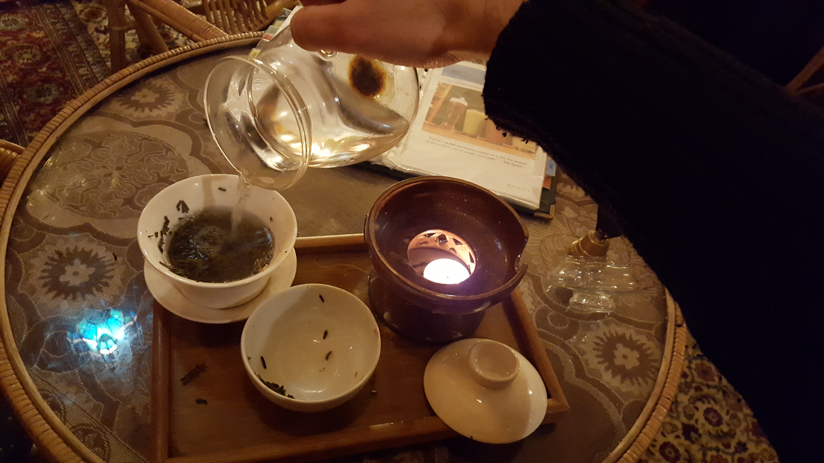 Description: A superior jasmine tea from Fujian, produced through seven successive cycles of blending in and removing jasmine flowers, it is especially suitable for drinking with close companions. The small, mossy-green leaves, flecked with white petals, hold a pervasive jasmine aroma, a distinctive lingering taste, and a mildly euphoric effect. - Taken from the menu at Dobra tea house (www.dobrateapgh.com)