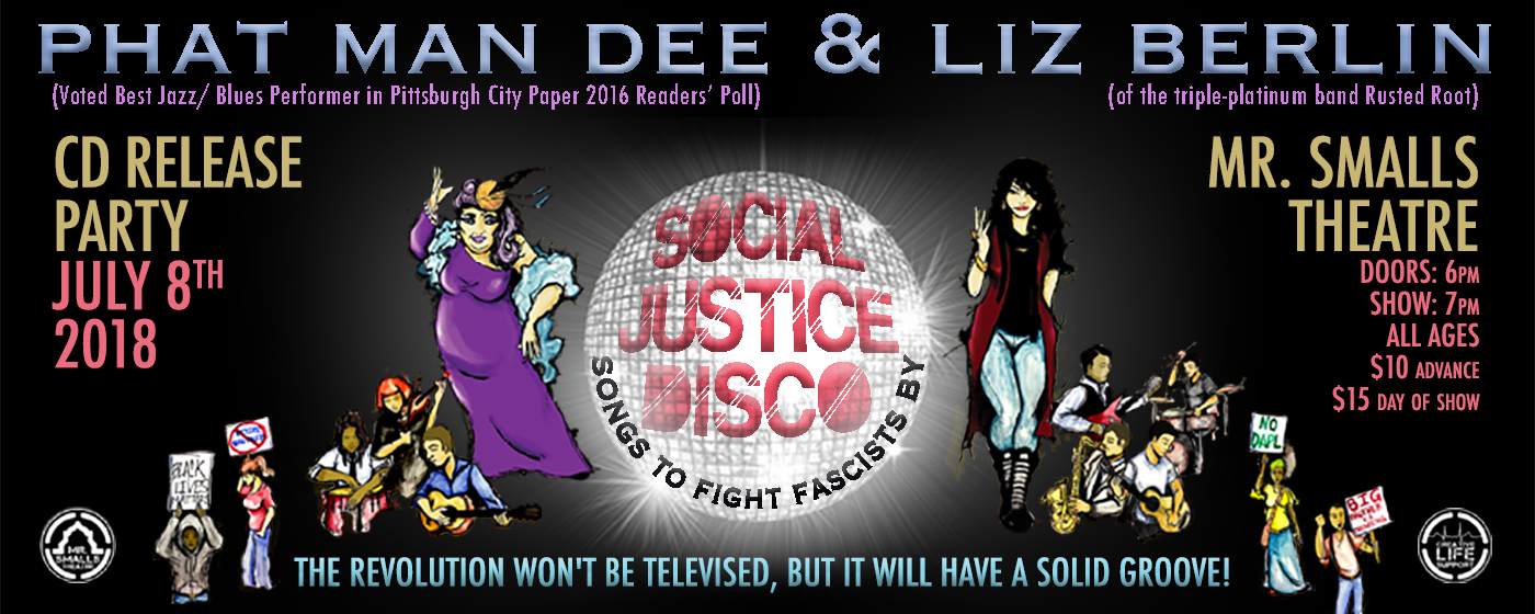 Social Justice Disco: Songs to Fight Fascists By is a collaboration between recording and touring artist Liz Berlin, of the triple platinum band Rusted Root, and Phat Man Dee, Pittsburgh cultural icon, voted Best Jazz/ Blues Performer in Pittsburgh City Paper 2016 Readers Poll. Together they have chosen to use their music to help create a world where all people are empowered and voices cannot be silenced, and they feel blessed to have collaborated with such a diverse and talented community of fellow artists who share the same goal. Featuring both original songs and reimagined classics, this concert experience merges the powerful vocal stylings of Liz and Mandee, mixing jazz, rock, gospel, poetry, dance, hip hop, and yes - DISCO, combined with a strong message of peace through the extreme application of equity and justice. New compositions included are: Fourth Reich Arising, Water Is Sacred/Mni Wiconi, Jim Crow is Alive and Well, I Dream of Robots Dreaming, #BigBrotherIsTrending, Black Lives Matter (sung to the tune of Staying Alive) and an original gospel arrangement of I Cant Breathe with featuring the Leamington Gospel Chorale. Covers include: For What its Worth (Buffalo Springfield), Your Racist Friend (They Might Be Giants), All You Fascists(Woody Guthrie/ Billy Bragg), Have You Been to Jail for Justice (Anne Feeney), I Will Survive (Gloria Gaynor), and Ball of Confusion(The Temptations). Liz Berlin and Phat Man Dee are committed to a reality where all people have an opportunity to live free and be themselves without fear of oppression, fighting the rising tide of hate and horror in the only way they know how, through melodic harmonies, powerful rhythms, soaring horn lines, lush strings, choirs and chants. The revolution may not be televised, but it will have a solid groove!
