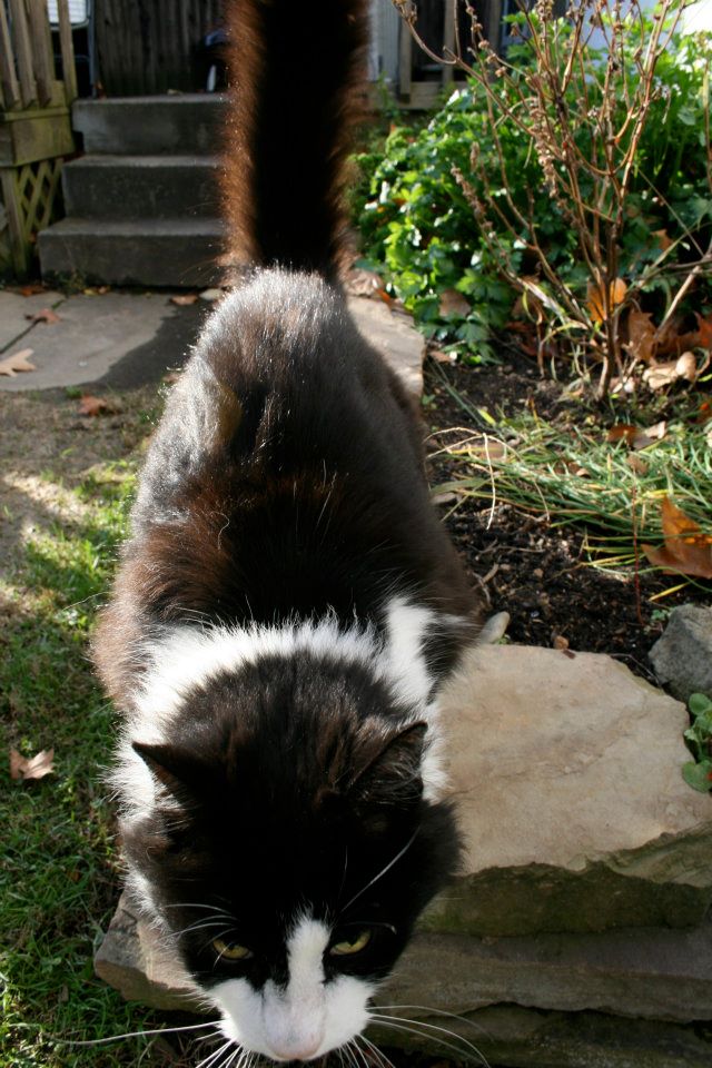 To sum up this feline, he (or is it she?), has been coming to my family's backyard for years now, starting in early as 2010. It is the summer of 2015 now and Silly still wants to be fed. So now my family buys cans of cat food on a regular basis. Wouldn't you think that 6 ounces of food would be enough for this cat? Wrong! He wants more...and more... and more. When the cat isn't busy eating ground chicken, beef and salmon, he's busy sleeping underneath the patio's raised garden bed, or even hunting for small birds. One time Silly took a dump on a hot summer day (and this was in 2015) and left it to melt on the cement part of the patio. I had to take the garden hose and set the 7 setting nozzle to "full stream" to wash that nasty little turd away. Was Silly upset we weren't feeding him on a daily basis? Was he feeling ill or has he gotten senile and old? We don't exactly know the exact age of this cat so perhaps its got some loose screws up there in its little noggin. Well, a year or so ago I planted some catnip for Silly and its taken full advantage of that stuff. I used to see him sitting in the small grove of catnip, blissed out and probably hallucinating. I tried to feed that cat some fruits and vegetables but all it wants is meat. One hell of a carnivore I have to say. That cat once used my raised beds as litter boxes so I had to put up a bit of fencing around it to keep the critter from relieving itself in my vegetable beds. That fence doubled as protection against rabbits and groundhogs too, I later realized. There's a duality in everything, isn't there? Well, anyway, I could keep going into more stories with this Silly cat but I don't want to waste your day. When I get a chance to add more recent photos of this cat, I will. For now, say hello to my little friend. :-)